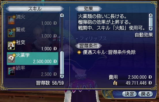 さて、DOLのほうですがケイトで火薬学を習得しました。