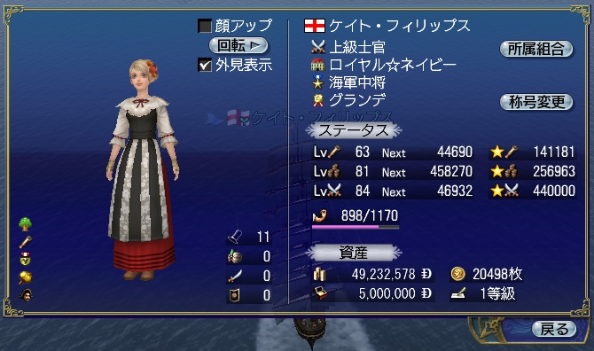 1stキャラ、メインキャラの座をケイトに奪われる。陸戦は鉄砲が主力、一応奥義まで習得している。工芸、鋳造、造船カンスト
