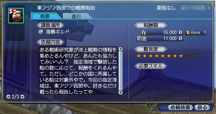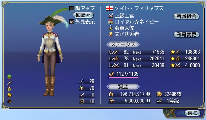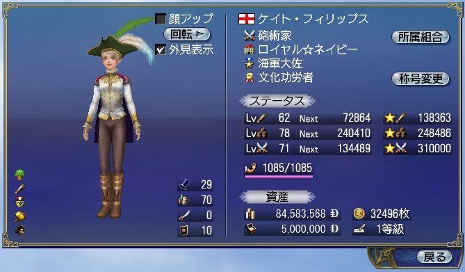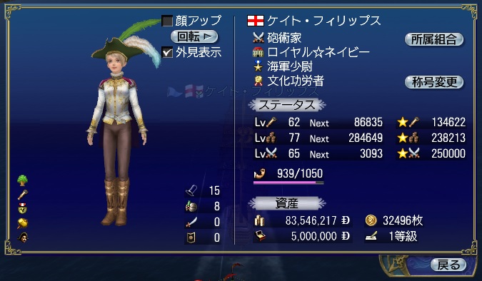 1stキャラ、メインキャラの座をケイトに奪われる。陸戦は鉄砲が主力、一応奥義まで習得している。工芸、鋳造、造船カンスト