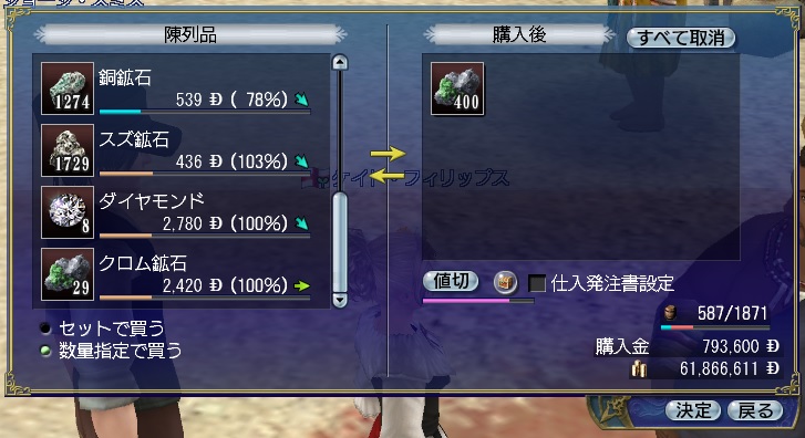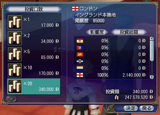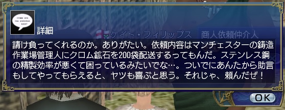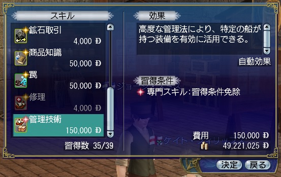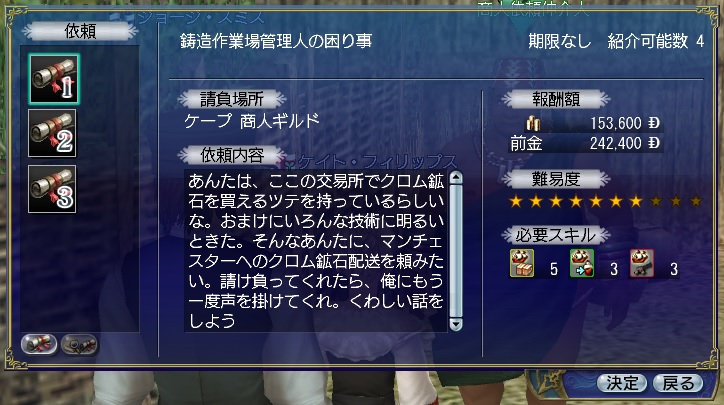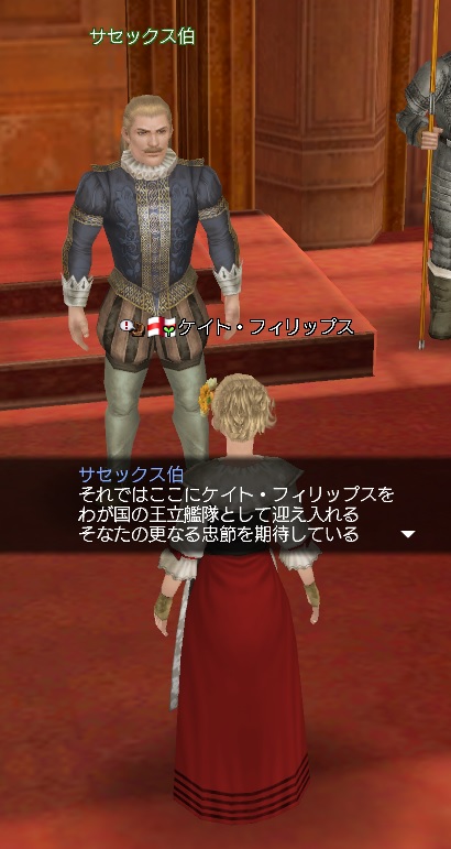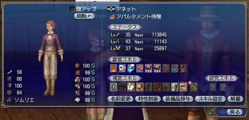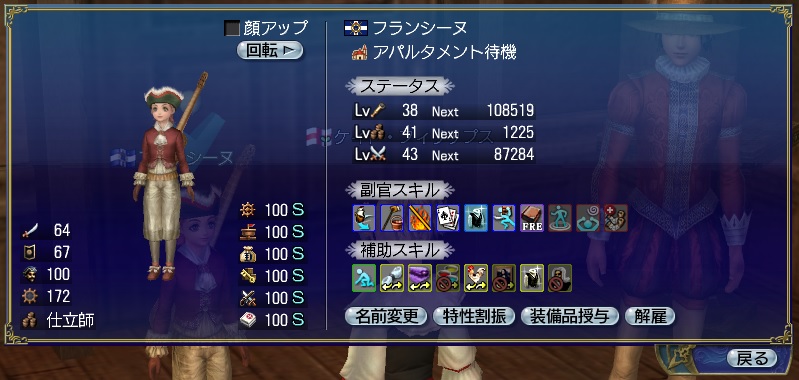 2ndキャラ、フランス出身だがイングランドに亡命する。取引スキルに圧迫されて冒険、海事スキルはほとんど持っていない。Lv条件を満たしてついに念願のフィロゾフになる。縫製、調理、工芸、鋳造カンスト、錬金術R13