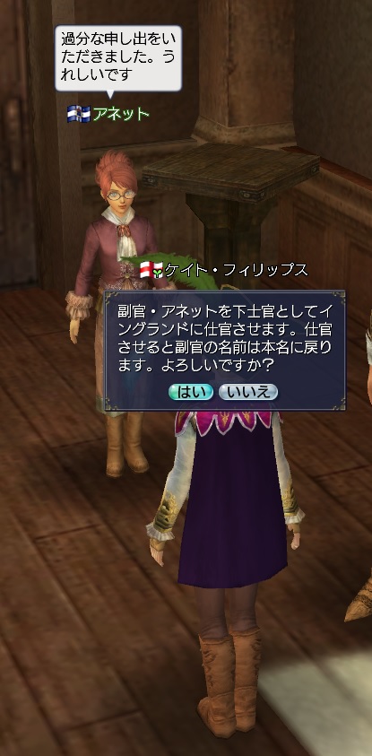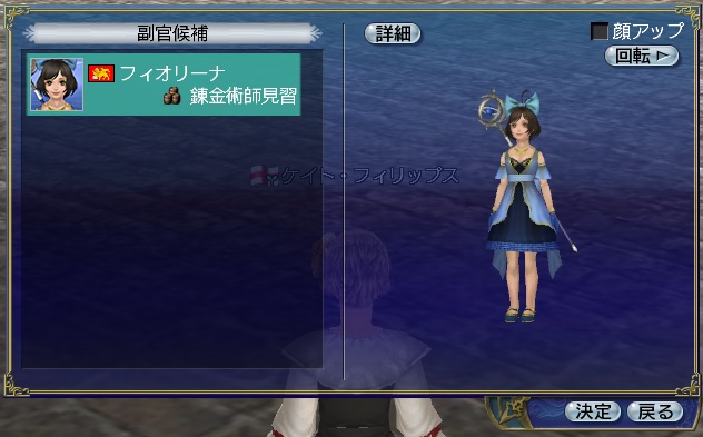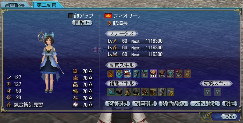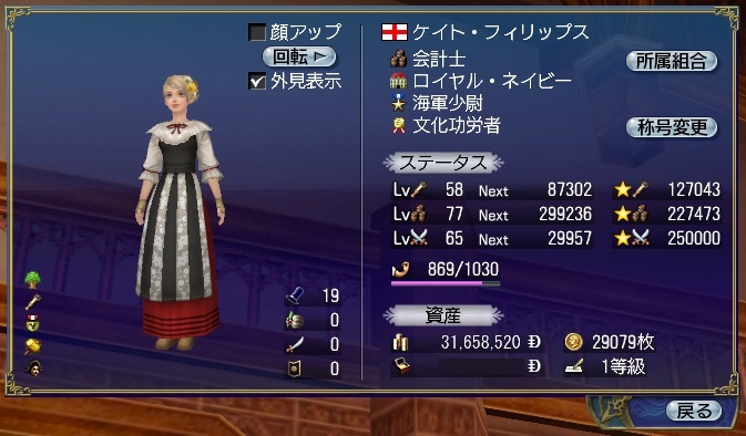 1stキャラ、メインキャラの座をケイトに奪われる。陸戦は鉄砲が主力、一応奥義まで習得している。工芸、鋳造、造船カンスト