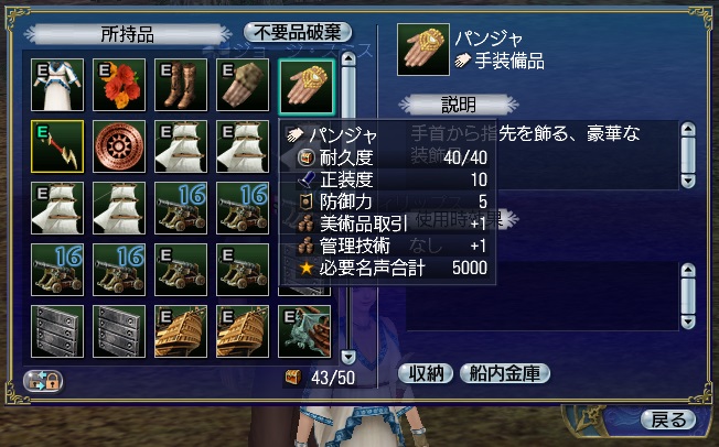 1stキャラ、メインキャラの座をケイトに奪われる。陸戦は鉄砲が主力、一応奥義まで習得している。工芸、鋳造、造船カンスト