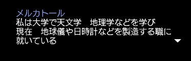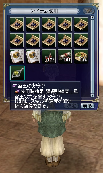 3rdキャラで冒険、海事キャラ。気楽に遊ぶキャラのはずが事実上のメインキャラとなる。3キャラの中で発見物が一番多い。たいていのことは一人でできる。最近はGガナ挑戦中。縫製、調理、工芸、鋳造カンスト