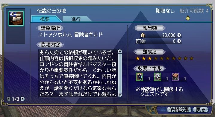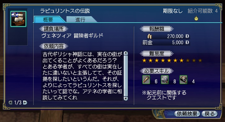 2ndキャラ、フランス出身だがイングランドに亡命する。取引スキルに圧迫されて冒険、海事スキルはほとんど持っていない。Lv条件を満たしてついに念願のフィロゾフになる。縫製、調理、工芸、鋳造カンスト、錬金術R13