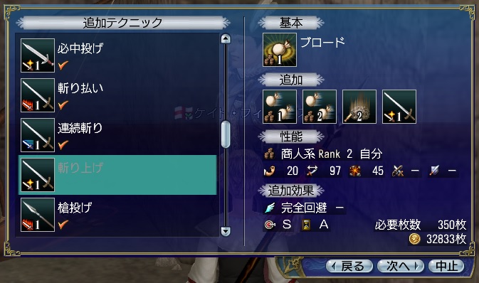 高難易度のダンジョンに行くときにはあったほうがいいので、ケイトでも完全回避テクを作ることにしました。