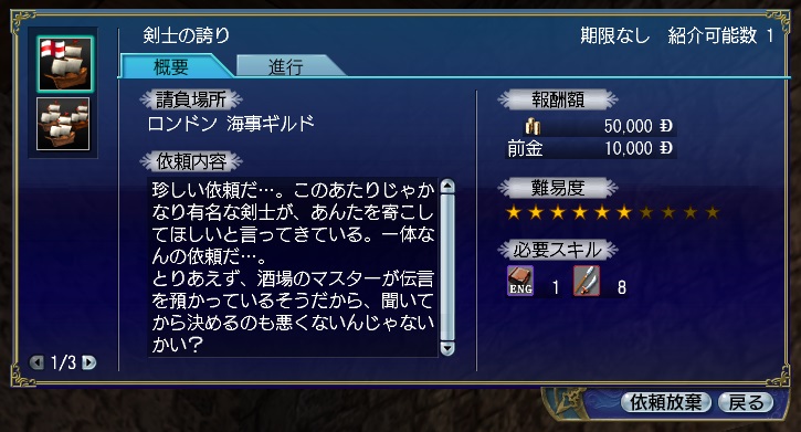 2ndキャラ、フランス出身だがイングランドに亡命する。取引スキルに圧迫されて冒険、海事スキルはほとんど持っていない。Lv条件を満たしてついに念願のフィロゾフになる。縫製、調理、工芸、鋳造カンスト、錬金術R13