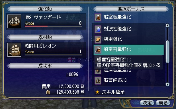 3/6   大ラテ、救命艇、特殊船倉で装甲と耐久を上げています。救命艇を使っているのは、強化ロープをたくさん作るのが面倒だったからです。救命艇は救命具と加鉄、加木で作れるので強化ロープに比べて作りやすいです。