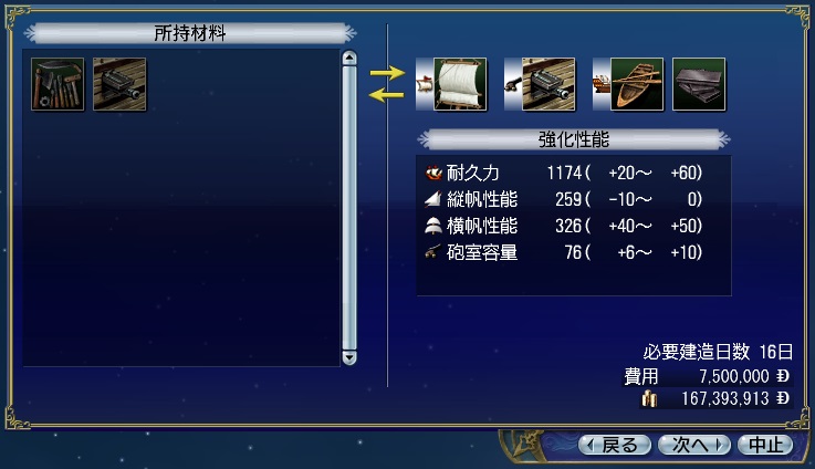 6/6  大スクウェア、改良大型砲門、救命艇、夜戦金属。途中で16門砲を5基つめないことに気付いて砲門を突っ込みました。夜戦金属はロマンです。