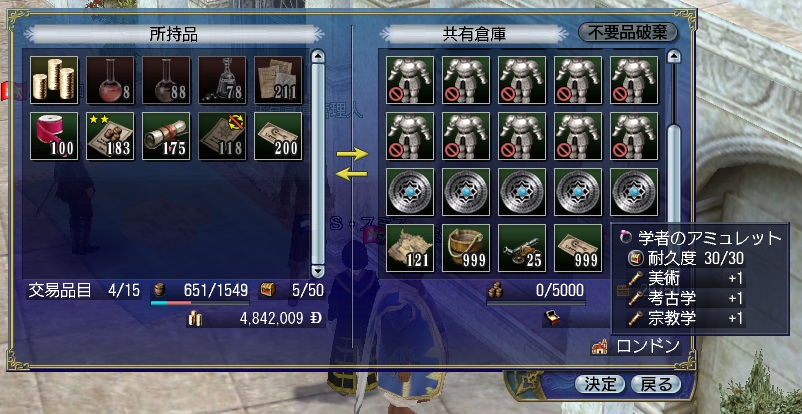 2ndキャラ、フランス出身だがイングランドに亡命する。取引スキルに圧迫されて冒険、海事スキルはほとんど持っていない。Lv条件を満たしてついに念願のフィロゾフになる。縫製、調理、工芸、鋳造カンスト、錬金術R13