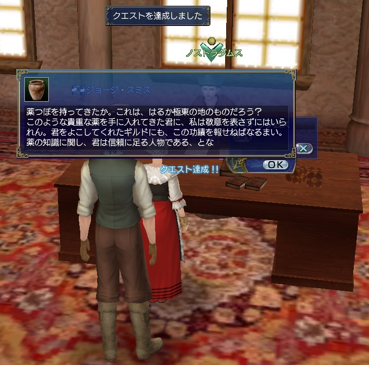 2ndキャラ、フランス出身だがイングランドに亡命する。取引スキルに圧迫されて冒険、海事スキルはほとんど持っていない。Lv条件を満たしてついに念願のフィロゾフになる。縫製、調理、工芸、鋳造カンスト、錬金術R13