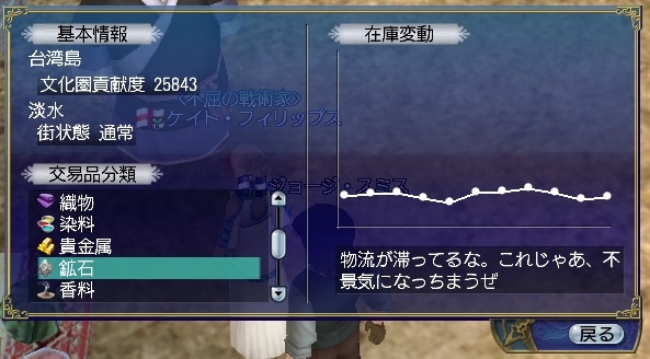 1stキャラ、メインキャラの座をケイトに奪われる。陸戦は鉄砲が主力、一応奥義まで習得している。工芸、鋳造、造船カンスト