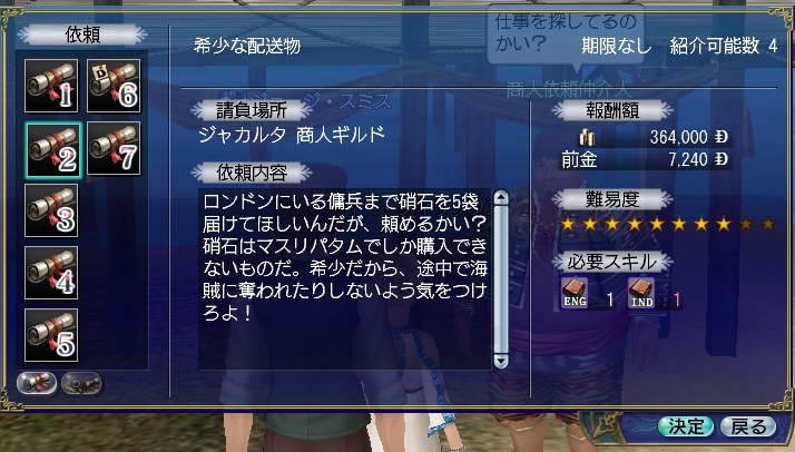 南蛮帰りにはカテクエをやるのですが、カテ2でロンドン行はジャカルタ発の「希少な配送物」です。硝石はショップ売りを使います。