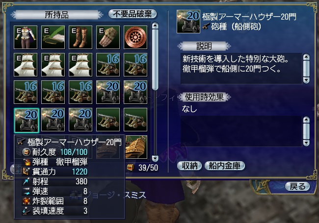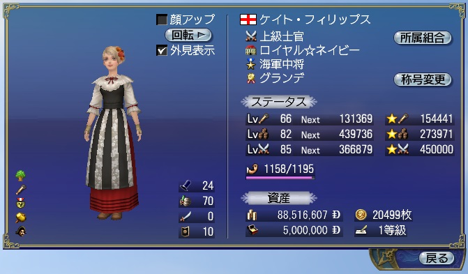 1stキャラ、メインキャラの座をケイトに奪われる。陸戦は鉄砲が主力、一応奥義まで習得している。工芸、鋳造、造船カンスト