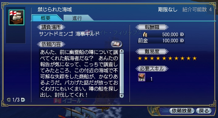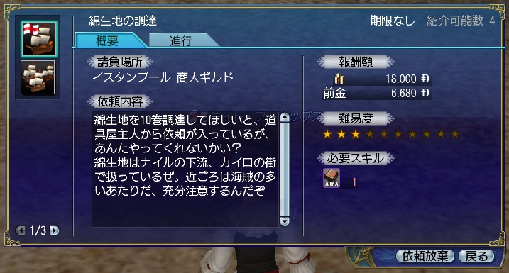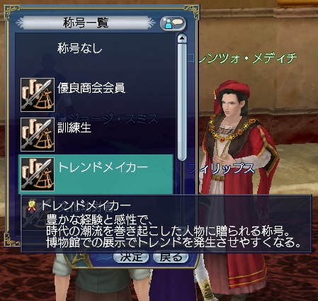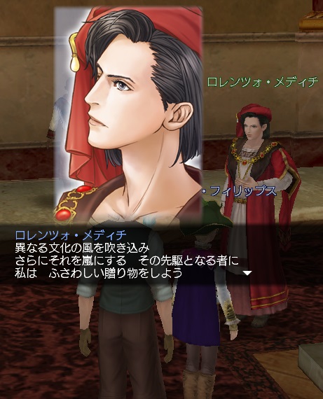 2ndキャラ、フランス出身だがイングランドに亡命する。取引スキルに圧迫されて冒険、海事スキルはほとんど持っていない。Lv条件を満たしてついに念願のフィロゾフになる。縫製、調理、工芸、鋳造カンスト、錬金術R13