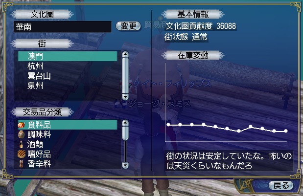 2ndキャラ、フランス出身だがイングランドに亡命する。取引スキルに圧迫されて冒険、海事スキルはほとんど持っていない。Lv条件を満たしてついに念願のフィロゾフになる。縫製、調理、工芸、鋳造カンスト、錬金術R13