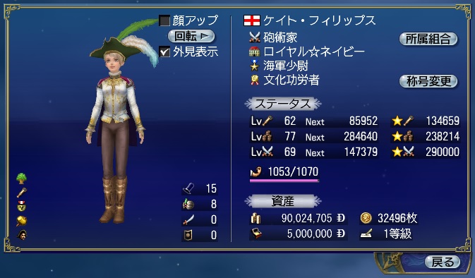 1stキャラ、メインキャラの座をケイトに奪われる。陸戦は鉄砲が主力、一応奥義まで習得している。工芸、鋳造、造船カンスト