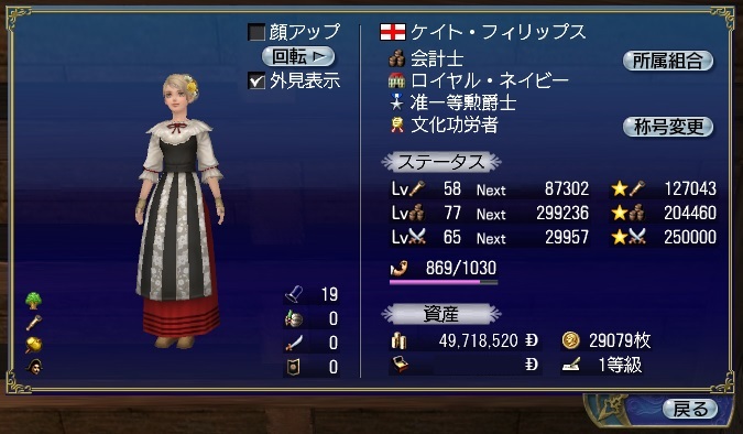 2ndキャラ、フランス出身だがイングランドに亡命する。取引スキルに圧迫されて冒険、海事スキルはほとんど持っていない。Lv条件を満たしてついに念願のフィロゾフになる。縫製、調理、工芸、鋳造カンスト、錬金術R13