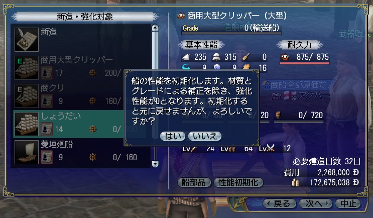 素材船は親方から買います。このとき、安いお船を買わないといけません。私は、ロンドンでリビルドや強化をしているので大キャラック級を使ってます。(商大キャラックとか重キャラック)イベリア方面でも使えるみたいですが、南仏、イタリア方面では使えません。アントワープなら大キャラック級が買えるのでアントワープでリビルドを済ませるのもいいと思います。(銀行近いしね)どこかで書いた気がしますが、スキルの移植はG0→G1のリビルドで済ませます。素材船を用意するのにお金がかかるからです。例外としては、何らかの理由で乗らなくなった船からスキルを移植する場合です。もし、その船がG3ならばスキル移植はG2→G3でするべきです。そのほうが安く上がります。