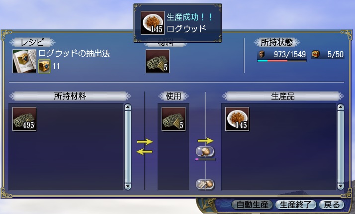 ログウットの操作は、高級染料を作れるのでいいですよ~PFで大きな葉を作ってると樹皮も取れるので私はちょくちょくやってる実験ですね~