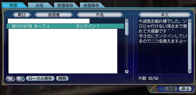 3rdキャラで冒険、海事キャラ。気楽に遊ぶキャラのはずが事実上のメインキャラとなる。3キャラの中で発見物が一番多い。たいていのことは一人でできる。最近はGガナ挑戦中。縫製、調理、工芸、鋳造カンスト