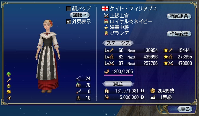 1stキャラ、メインキャラの座をケイトに奪われる。陸戦は鉄砲が主力、一応奥義まで習得している。工芸、鋳造、造船カンスト